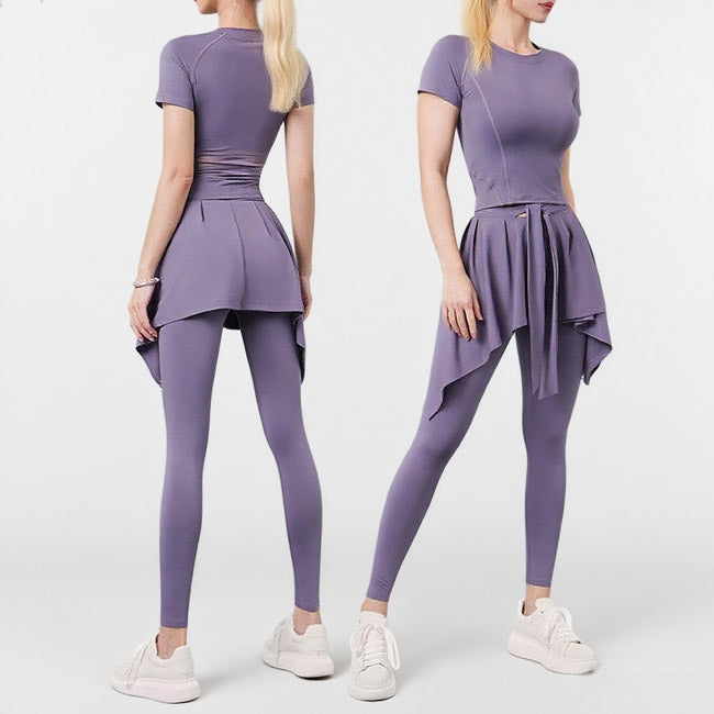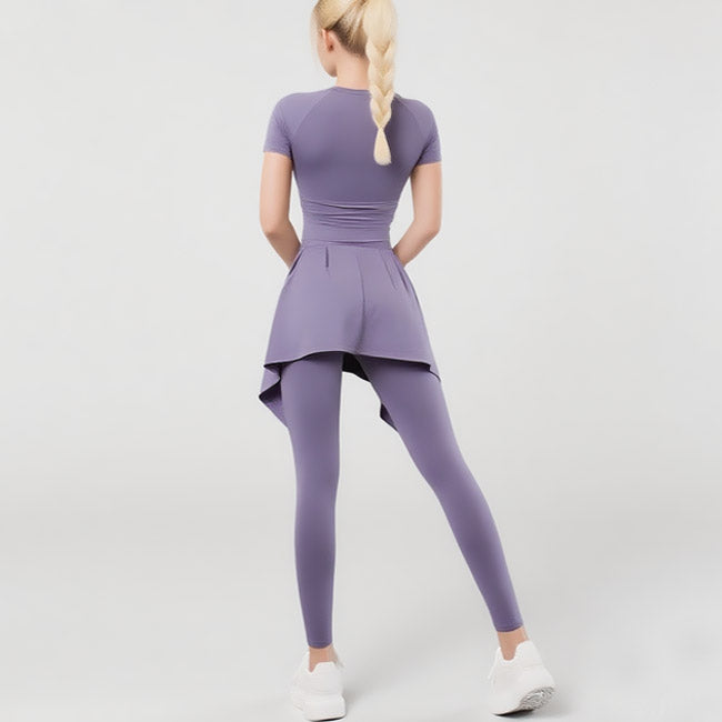 Discover the perfect blend of style, comfort, and sustainability with our 2-piece women's yoga set. Featuring a short-sleeved top and leggings with an elegant faux-skirt design, this activewear set is ideal for yoga, fitness, running, and everyday wear.